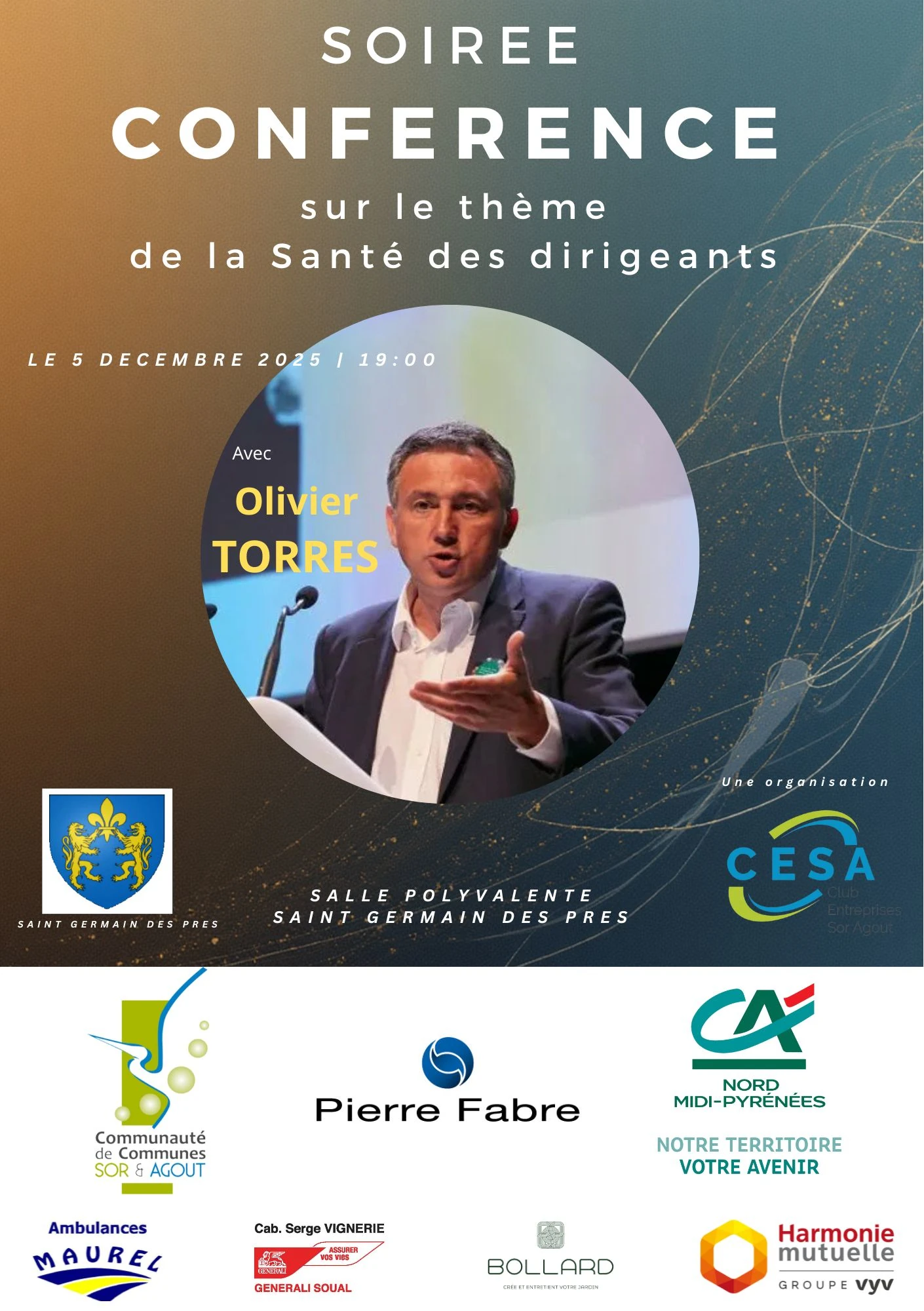 Cette conférence est organisée par le Club d’Entreprises Sor et Agout (CESA) qui fera intervenir Olivier TORRES. Elle se déroulera dans la salle polyvalente de Saint-Germain-des-Prés, le 5 décembre 2025 à partir de 18h45.